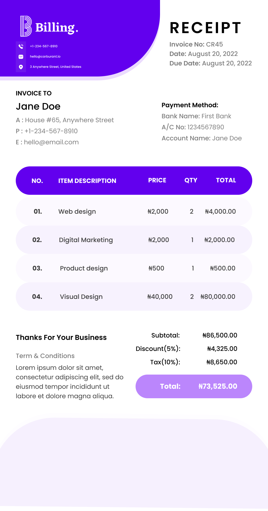 - Online Payment Receipts: This is auto-generated once a customer pays through an online platform like Paystack, Stripe, or Flutterwave.